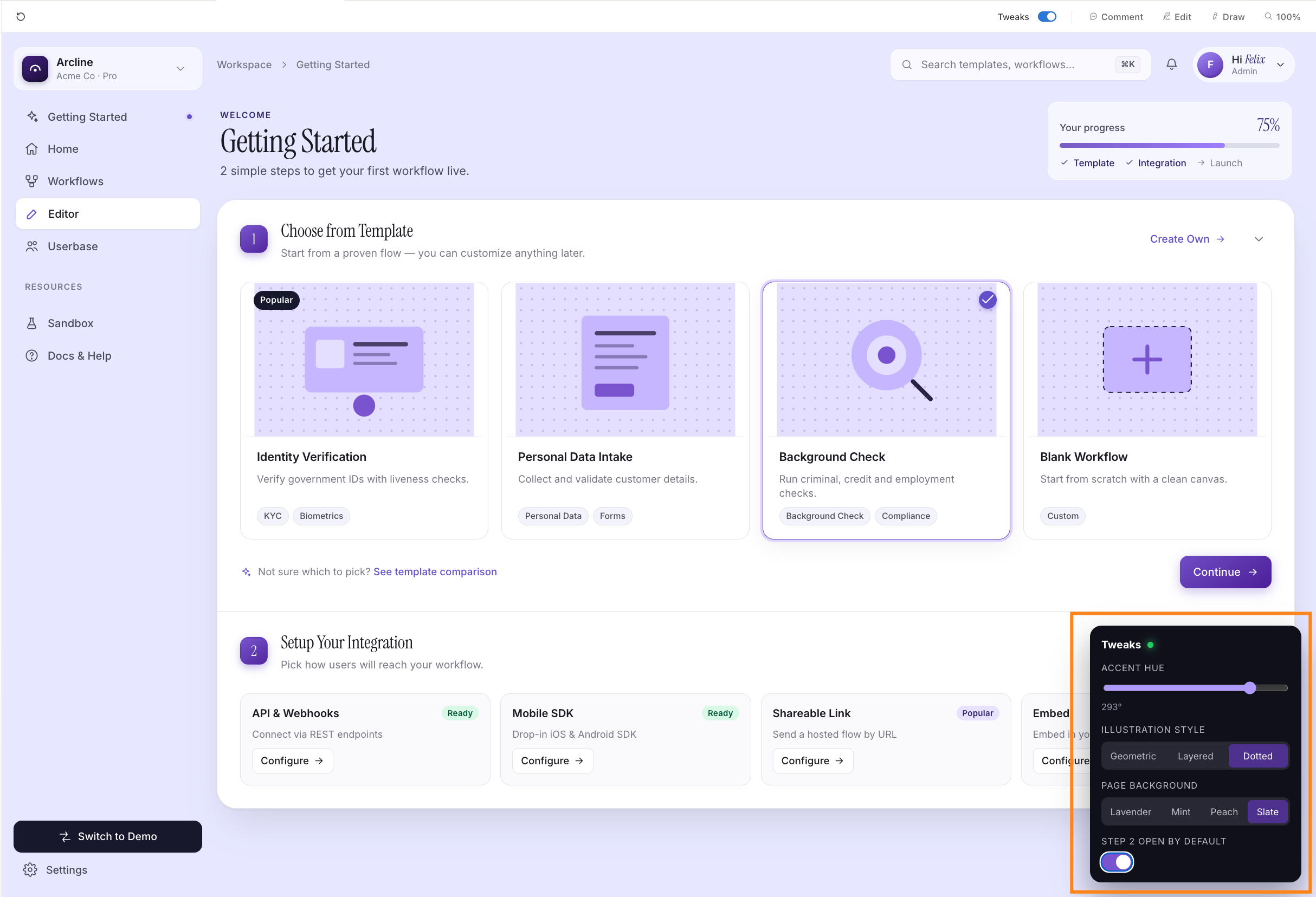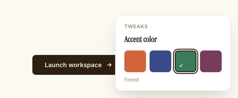 The first draft almost never matches your intended colors or visual style exactly. Tweaks fixes this globally in one move. One adjustment changes every screen at once - the accent color, the illustration style, the background tone. It is completely free. It takes 90 seconds.