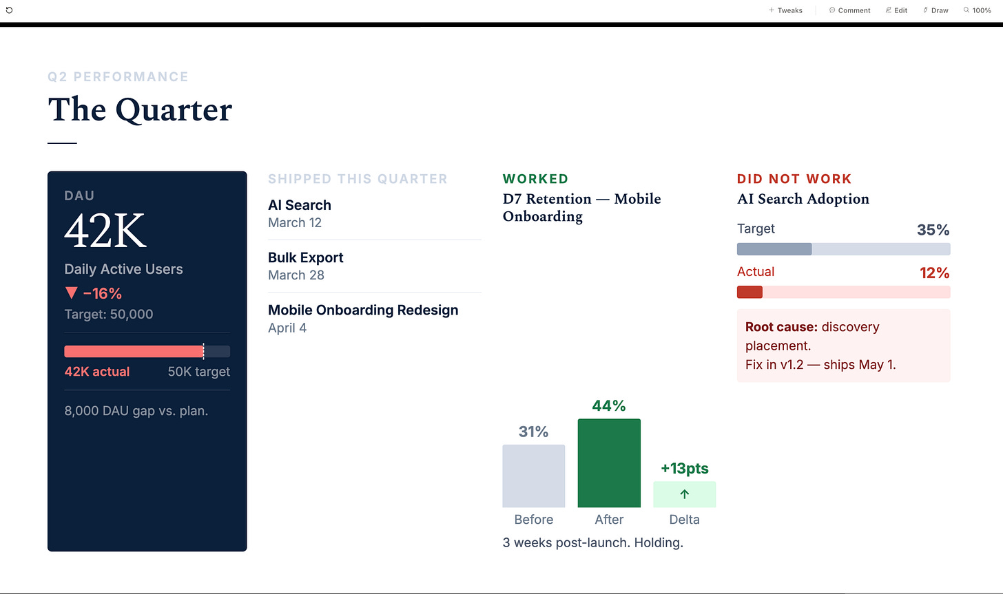 Make the sample data feel real for [your industry or context].→ Share: Share → Copy link. The person opens it in a browser. No account. No download. They just click through it.