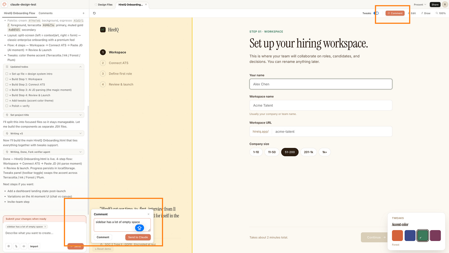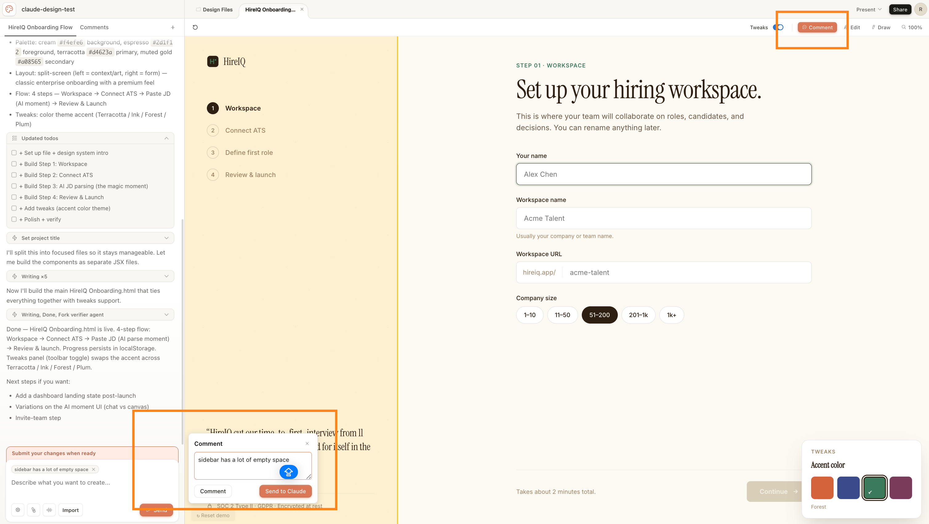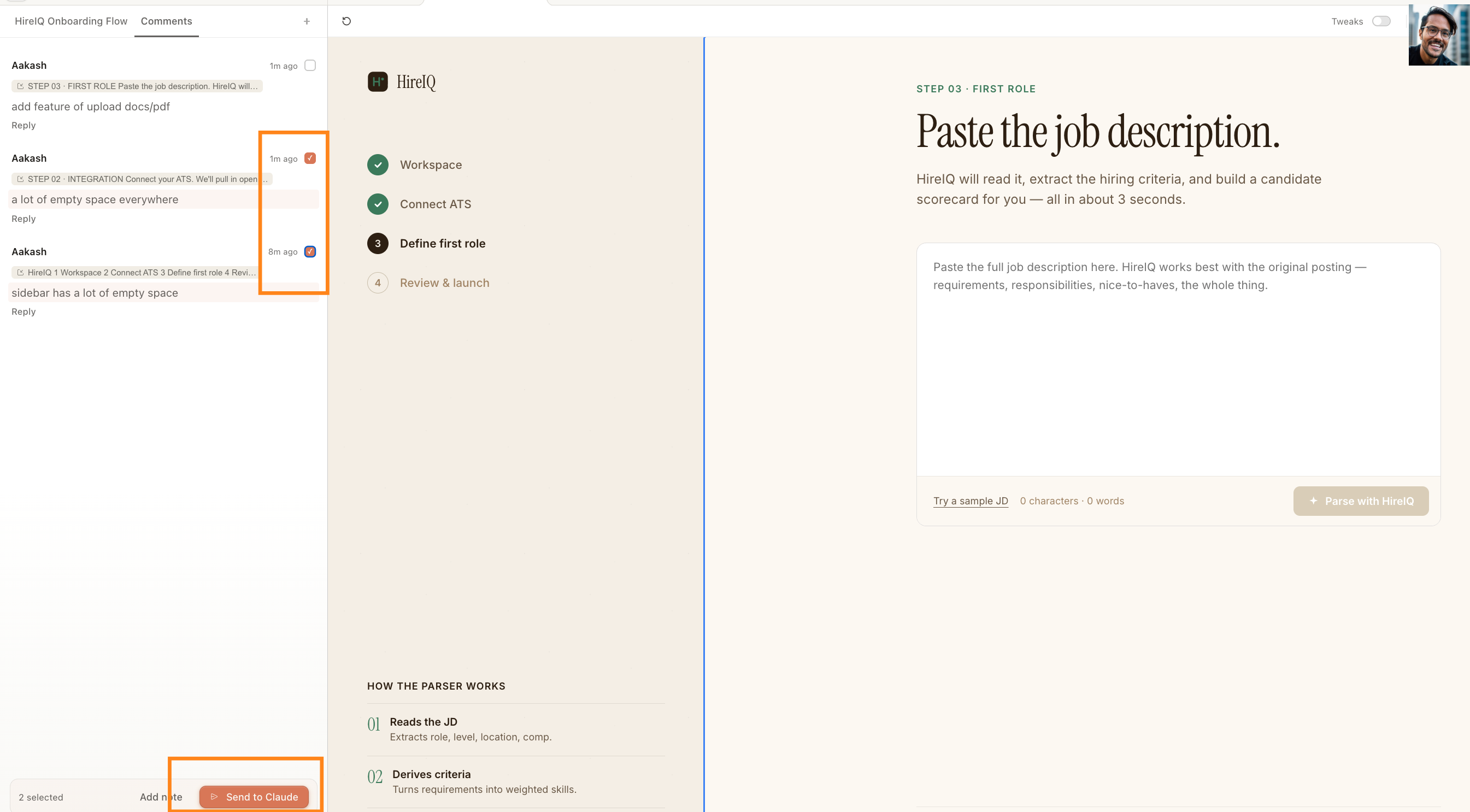 Write a specific note, select the section it applies to, and batch everything before sending. Three changes in one send, not three separate sends. Each send is a full AI call. “Make the second screen show the results before asking for payment” works. “This feels wrong” does not give Claude enough to act on.