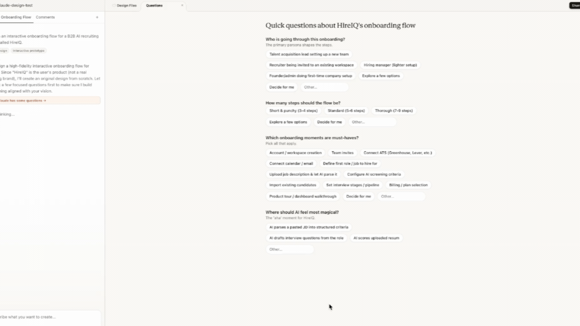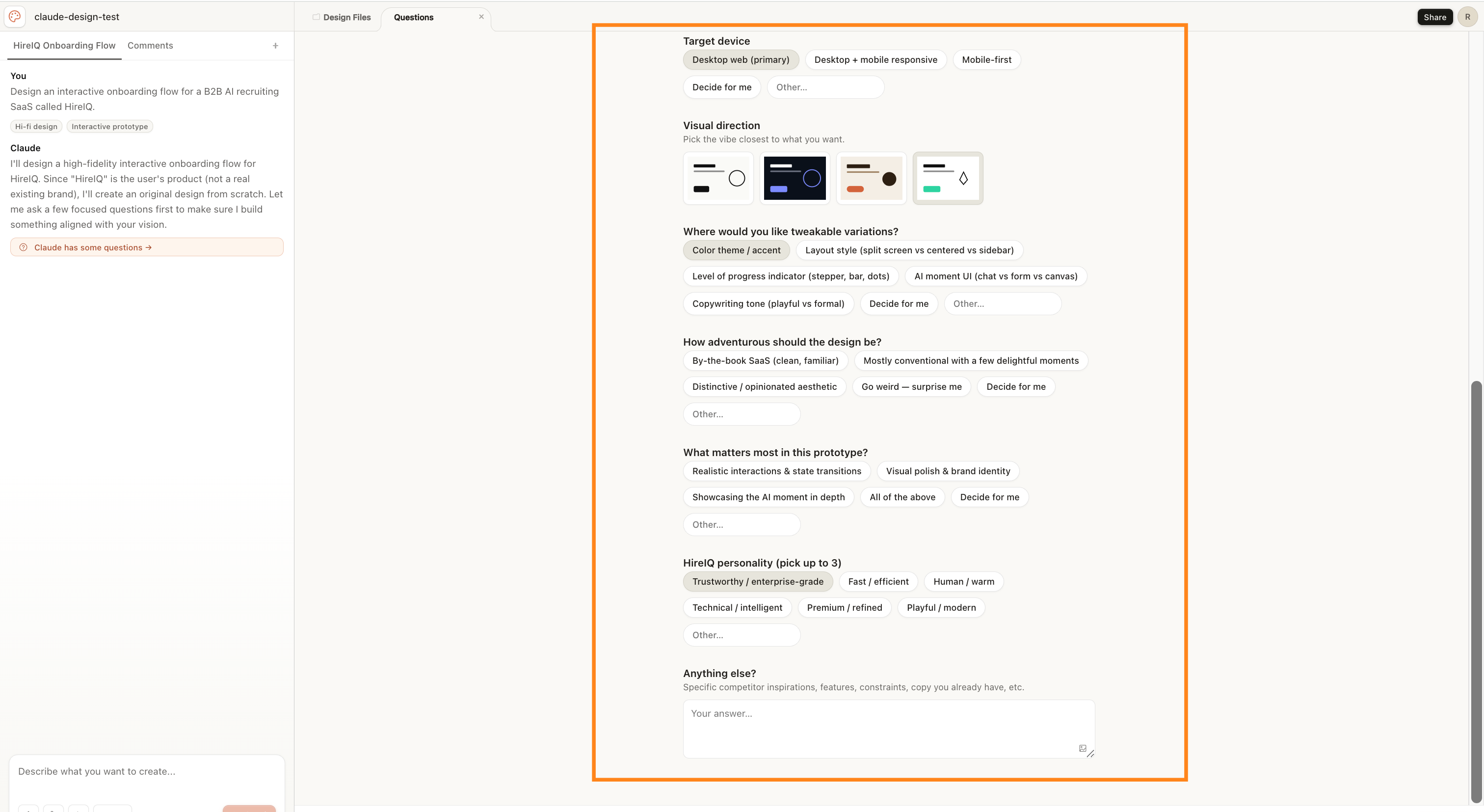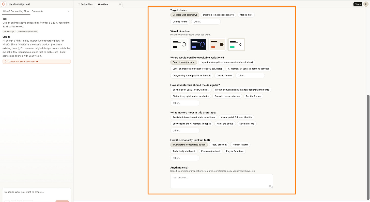 Before Claude generates, it asks you four clarifying questions about visual direction, tone, how adventurous the design should feel, and brand personality.