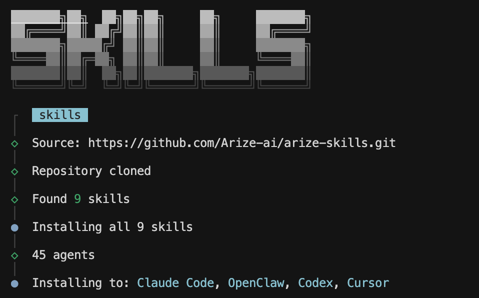 npx skills add Arize-ai/arize-skills --skill '*' --yesThat is the whole installation. One command and your Claude Code agent has native knowledge of the Arize eval stack.