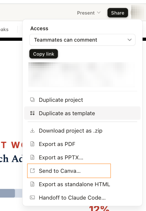 Tone: Confident. No filler slides. Every slide earns its place.→ Export: Share → Export as PPTX for PowerPoint or Keynote, or Send to Canva if you want to keep editing it there.
