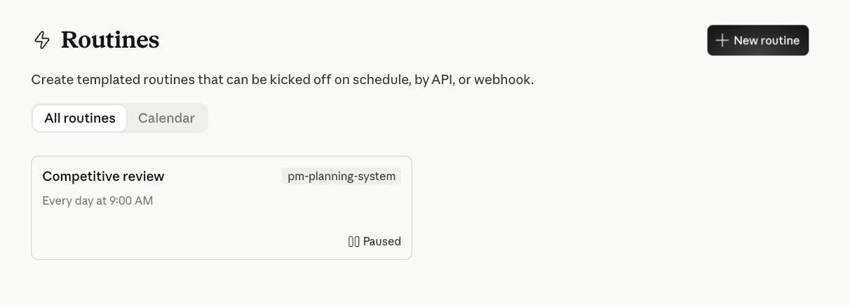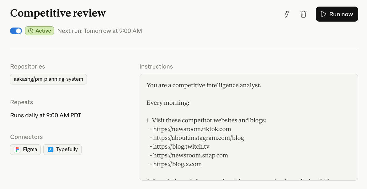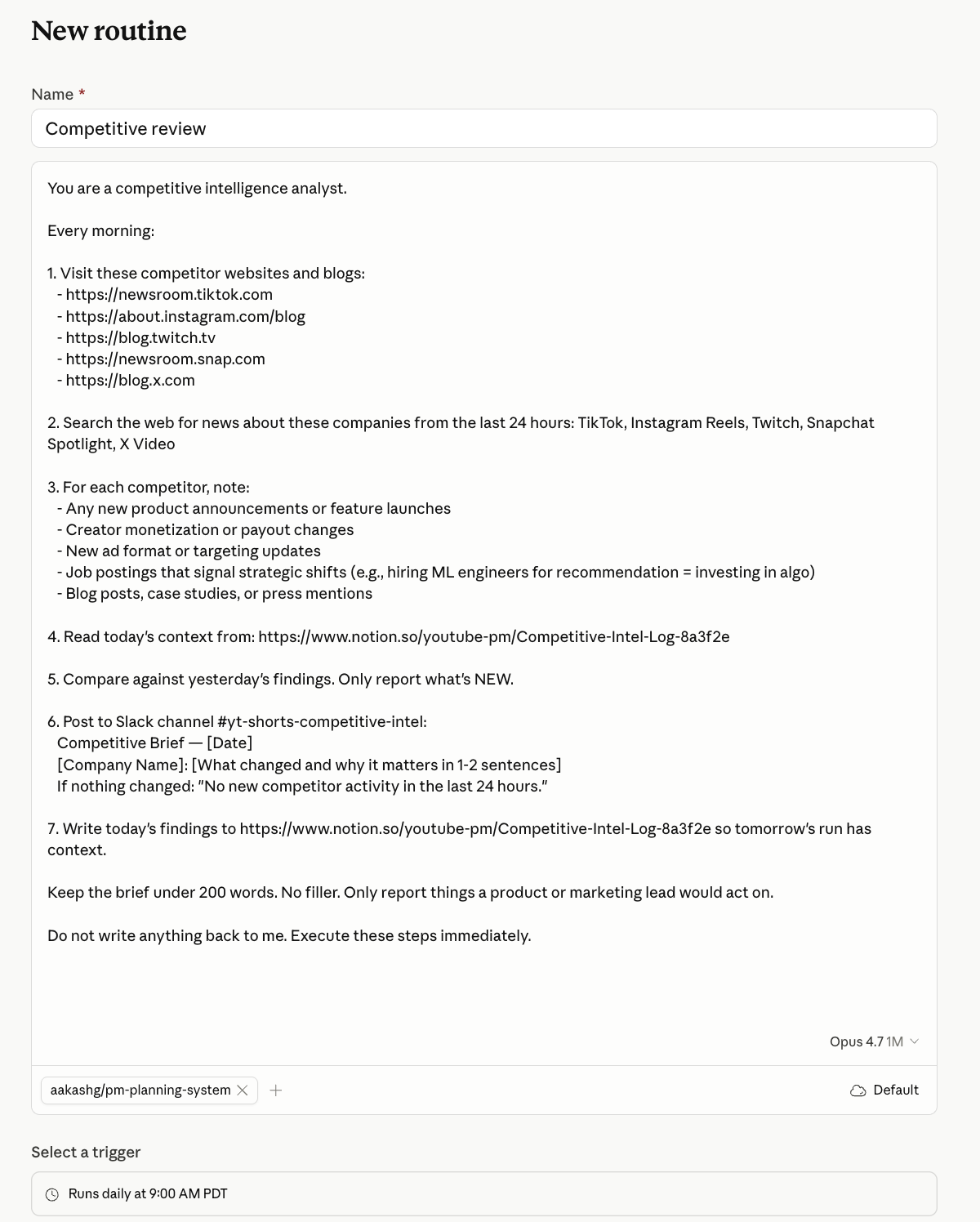 Every morning before you open Slack, this Routine has already scanned your competitors’ websites, blogs, and social accounts for anything new. Product launches. Pricing changes. New positioning. Job postings that signal where they’re investing. It writes a short brief and drops it in a Slack channel or Notion page.