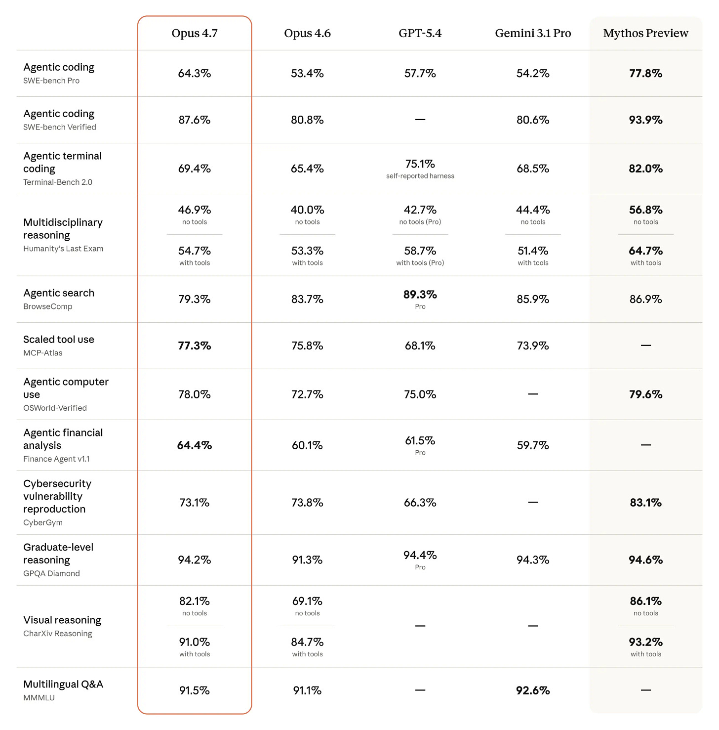Anthropic released Claude Opus 4.7 on Thursday. It’s the best publicly available model for agentic coding. They also put the model they decided was too dangerous to release to the public in the same comparison table and showed you the gap on a chart.