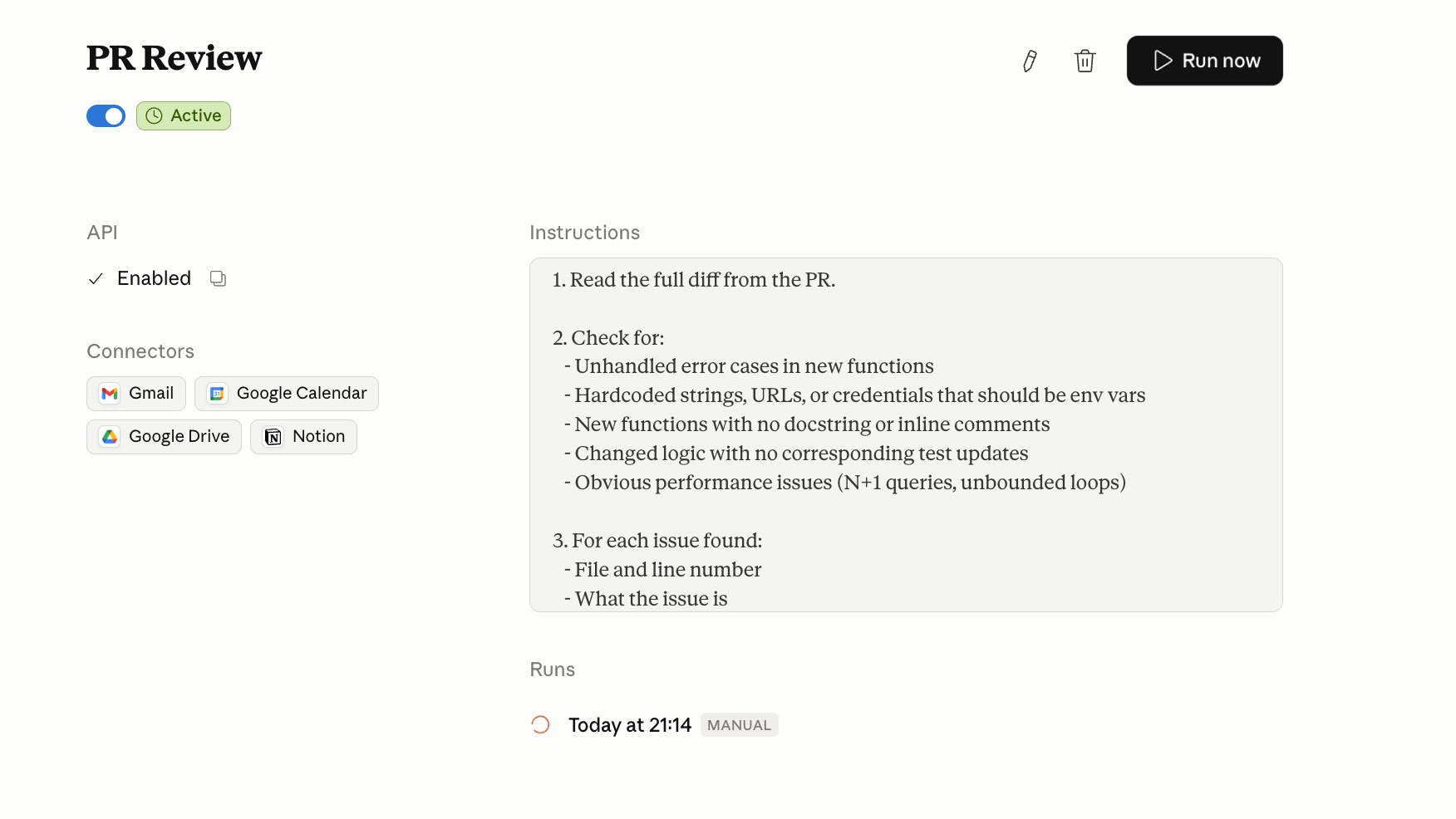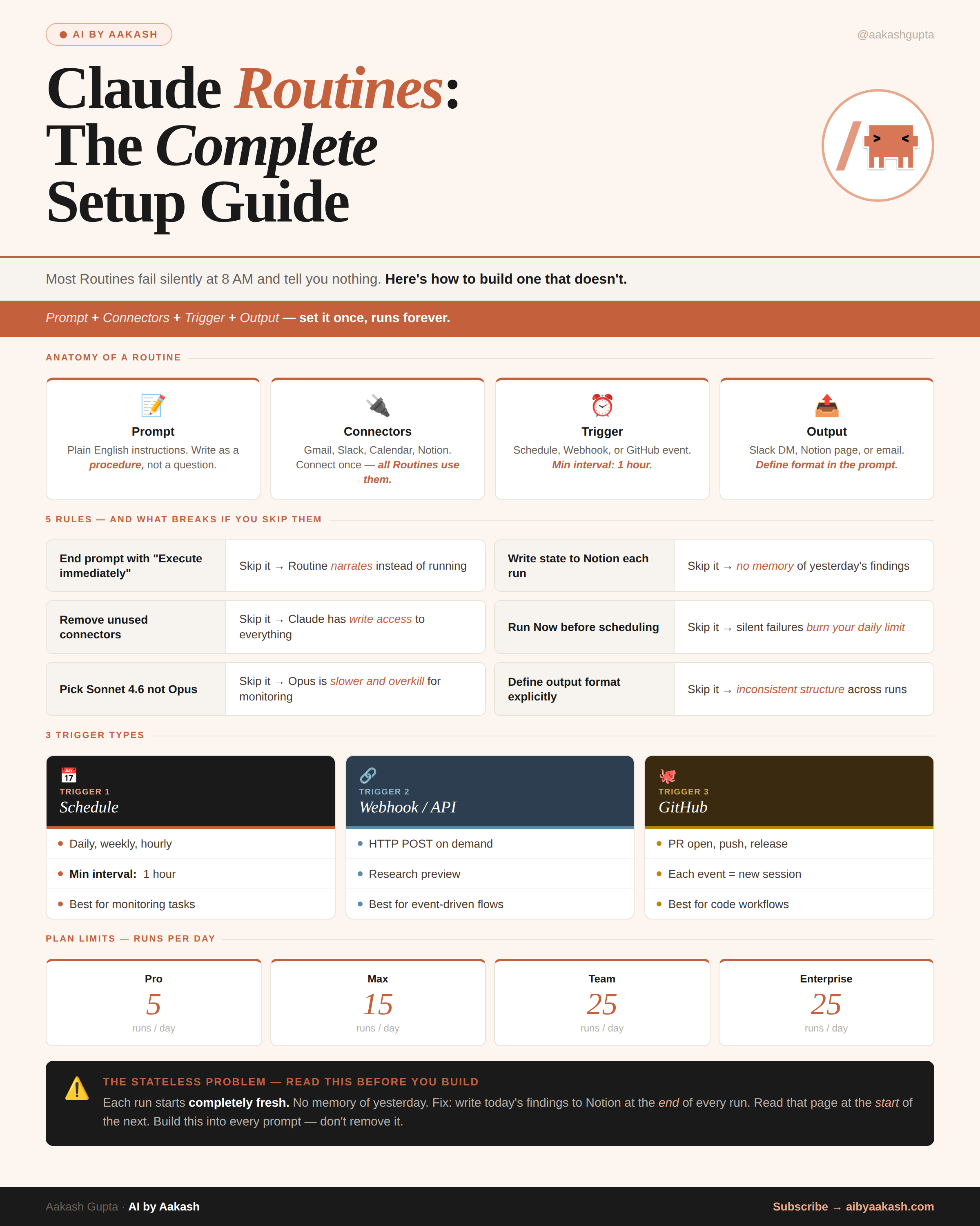Every Routine run starts from zero. No memory of yesterday. If your Routine needs continuity (what changed since the last run, what issues are still open, what you already flagged), write today’s output to Notion at the end and read it back at the start of the next run. Every prompt below assumes you’re doing this.