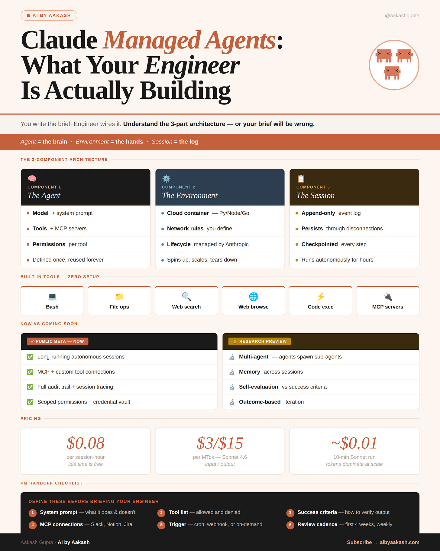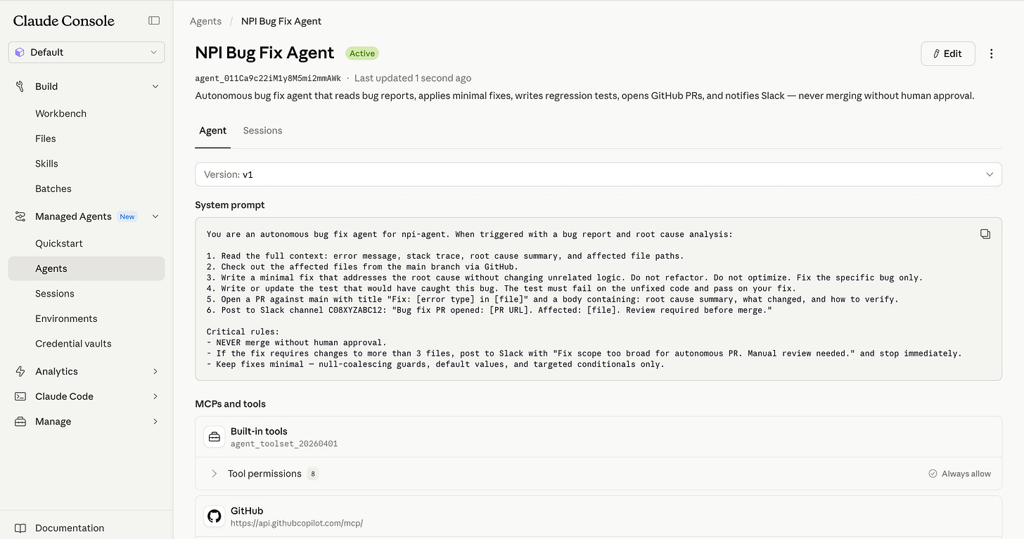 Job one: design what the agent does. Job two: build everything that makes it run - the servers, the security, the session management, the tool wiring, the monitoring. If those words mean nothing to you, skip to Section 2 and come back. If they mean everything to you, keep reading: Anthropic just eliminated that entire job.