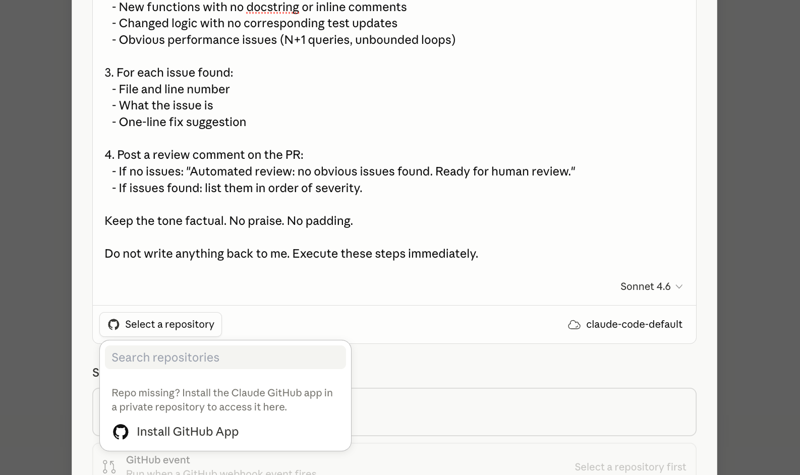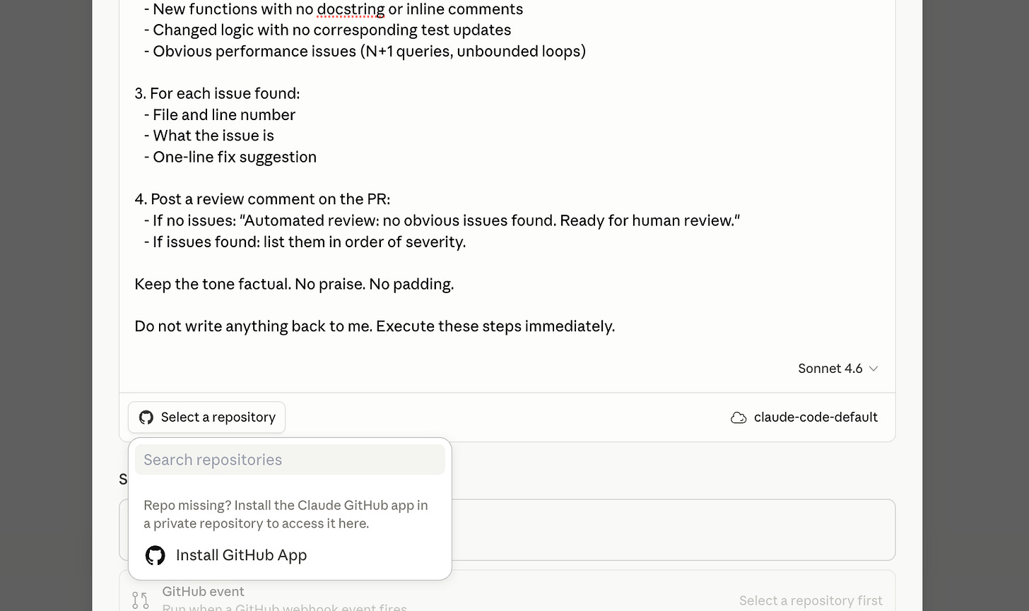 "Fix scope too broad for autonomous PR. Manual review needed."After launch: the scope limit (”more than 3 files, stop”) is the most important line. Remove it and you’ll get PRs that touch half the codebase. Keep it for the first month.