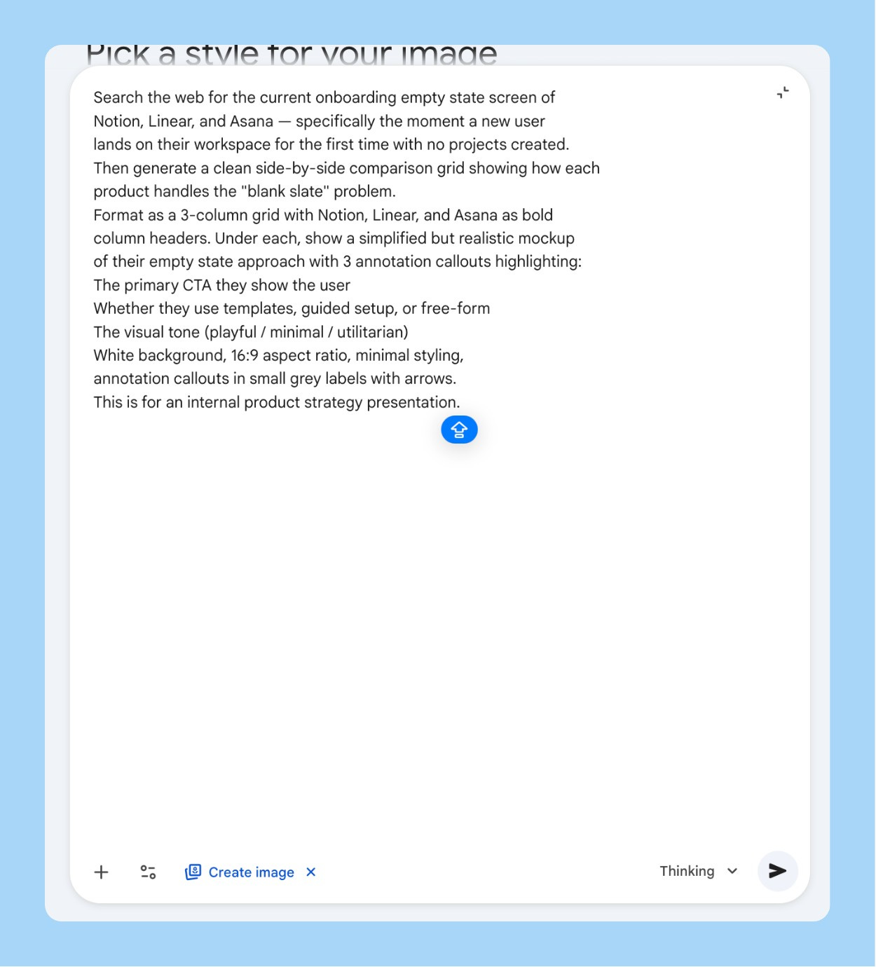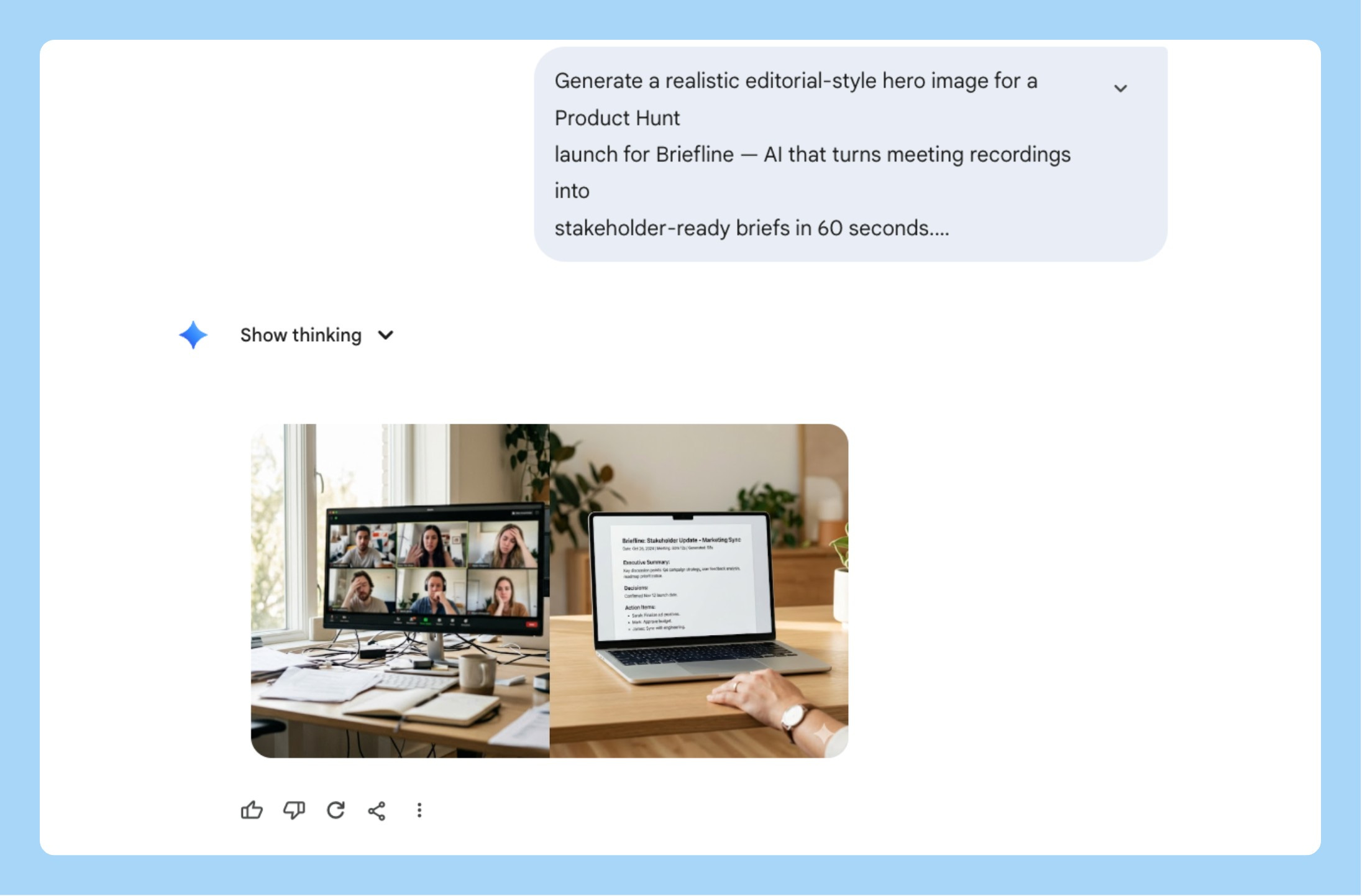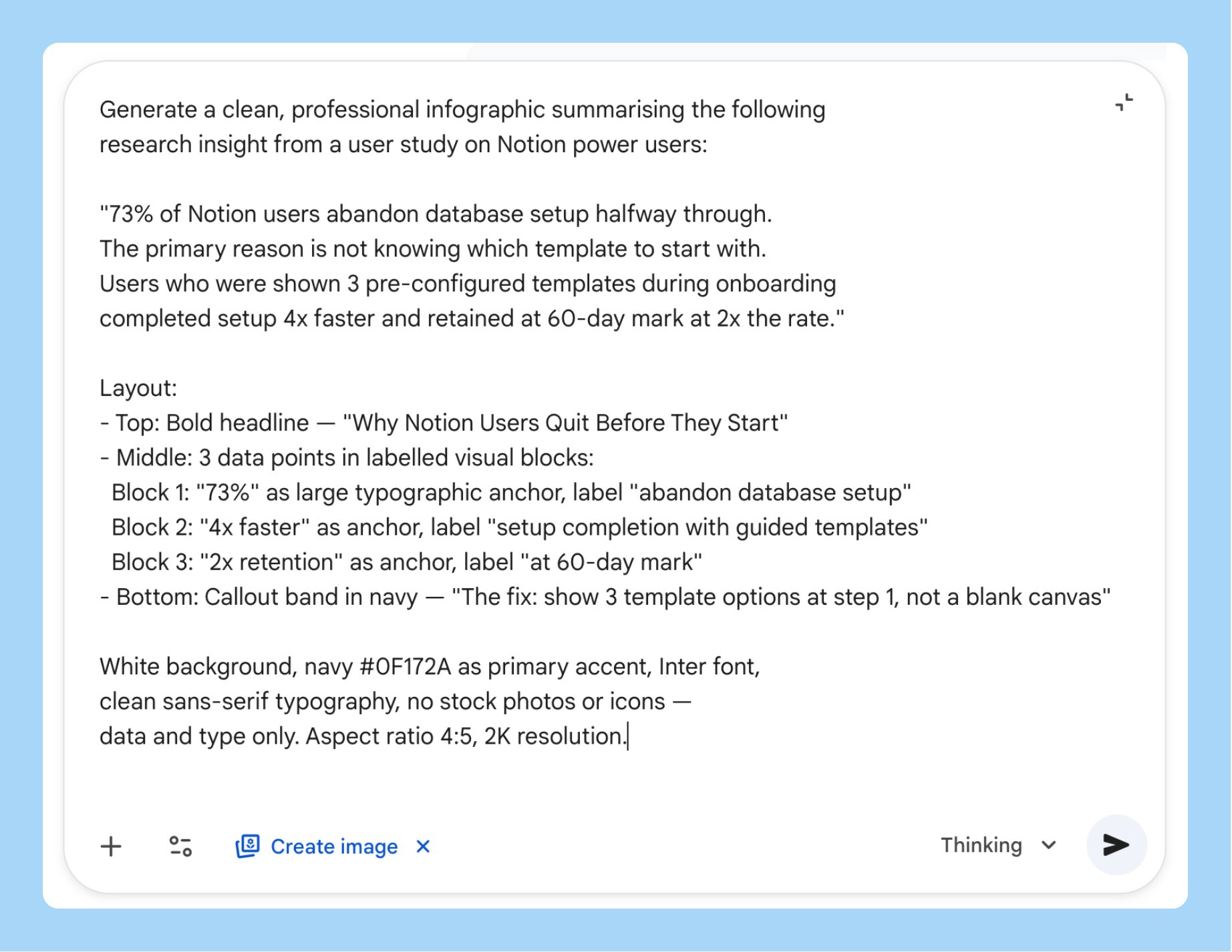 Tell it where the output is going. “For a Notion page,” “for a 16:9 slide,” “for Slack” - this changes how Nano Banana 2 handles margins, text sizing, and resolution. I skip this when I’m rushing and then I’m always resizing manually afterward.
