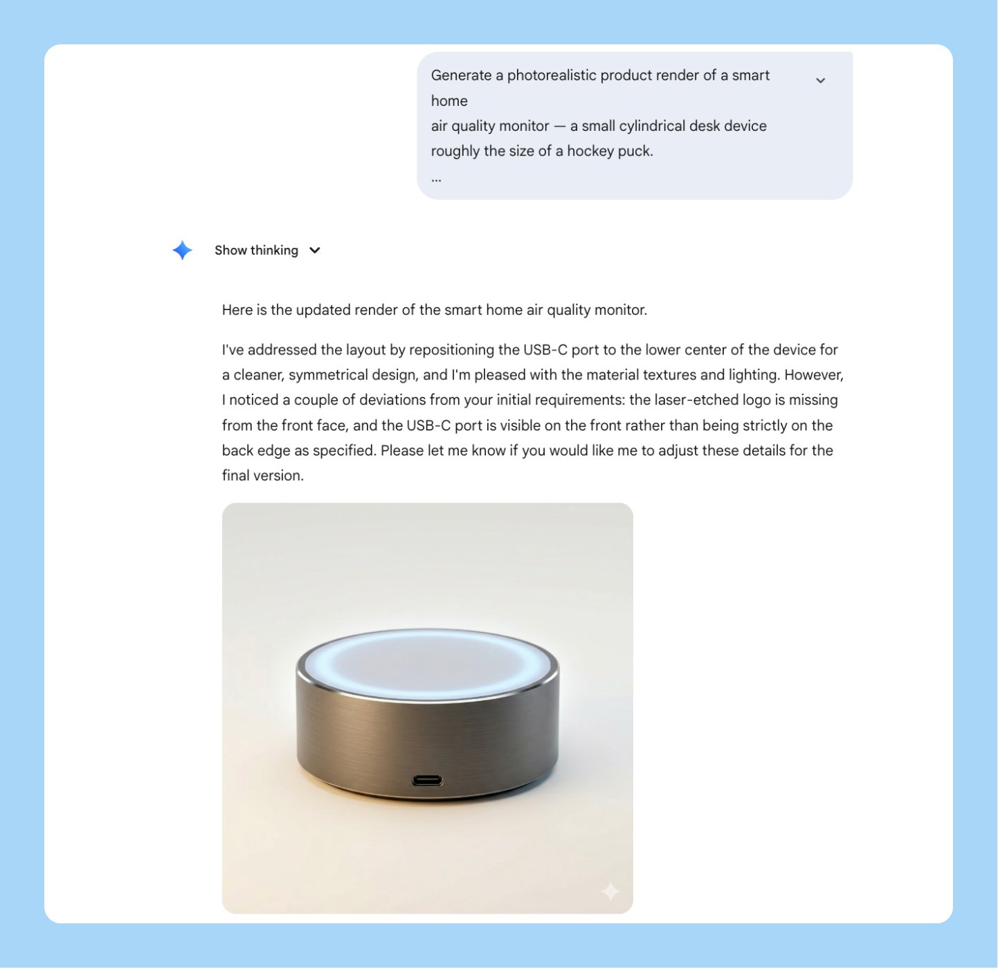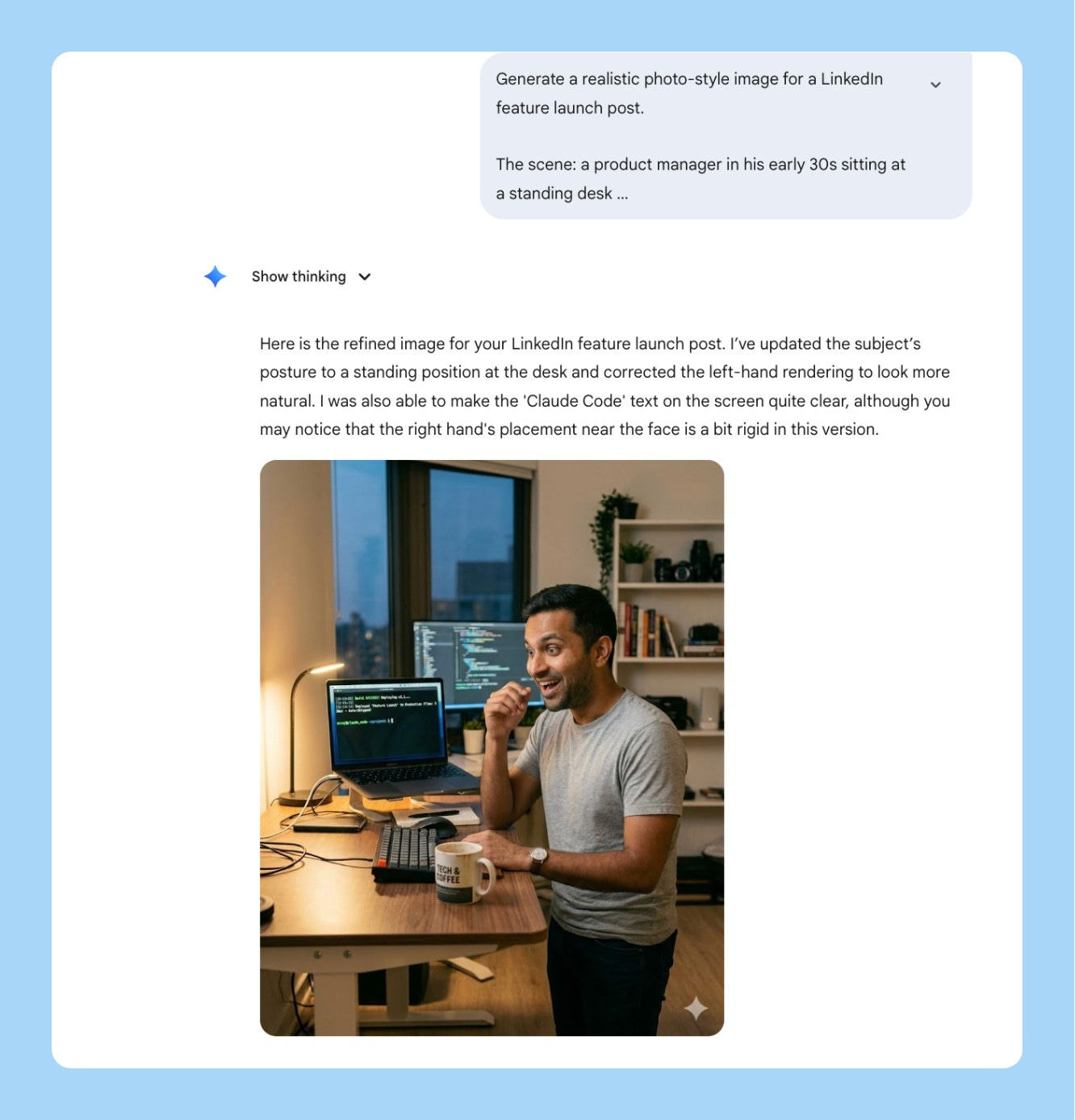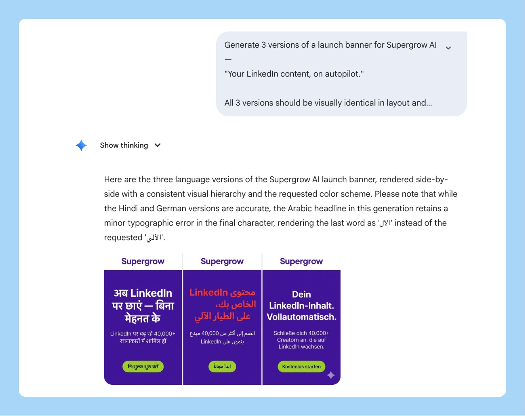 Tell it where the output is going. “For a Notion page,” “for a 16:9 slide,” “for Slack” - this changes how Nano Banana 2 handles margins, text sizing, and resolution. I skip this when I’m rushing and then I’m always resizing manually afterward.